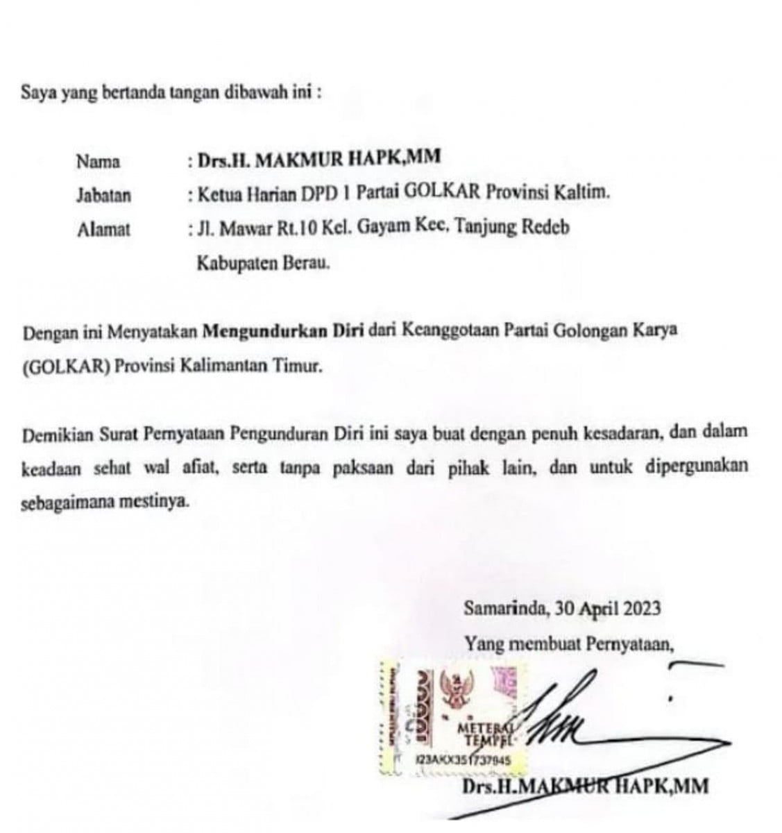 SAMARINDA, Sudah puluhan tahun mengabdi di Partai Golongan Karya (Golkar), akhirnya mantan Bupati Kabupaten Berau Makmur HAPK resmi mengundurkan diri dari partai yang sudah membesarkan namanya tersebut.