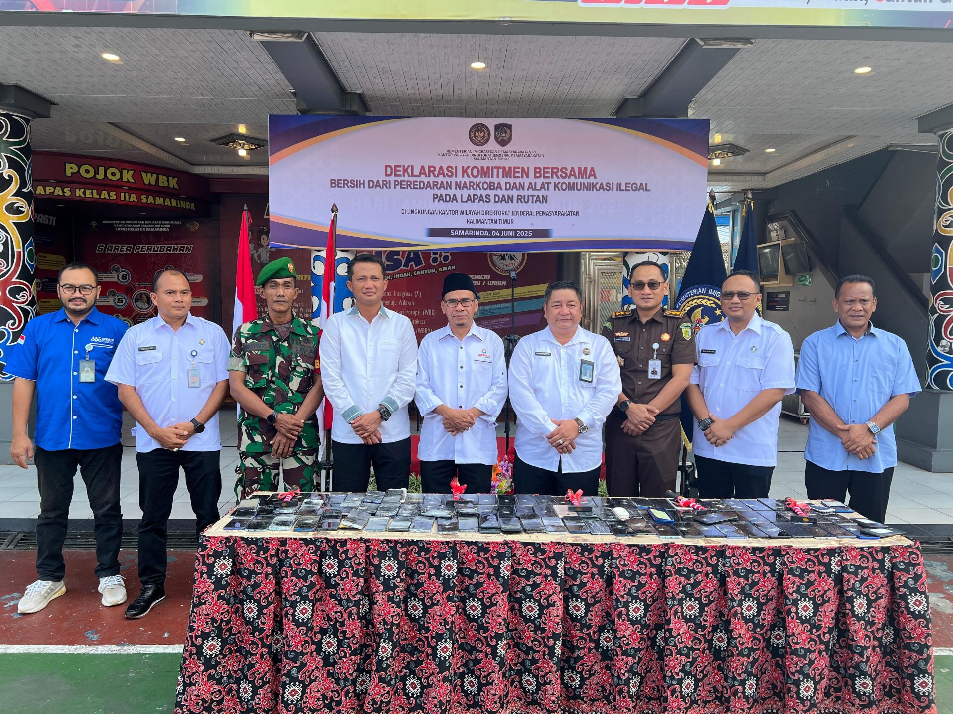 SAMARINDA.nusantaranews.info — Seluruh Kepala Lembaga Pemasyarakatan (Kalapas) dan Kepala Rumah Tahanan (Karutan) se-Kalimantan Timur dan Kalimantan Utara mendeklarasikan komitmen bersama untuk mewujudkan lingkungan pemasyarakatan yang bersih dari narkoba dan handphone (HP) ilegal, pada Rabu (04/06/2025).