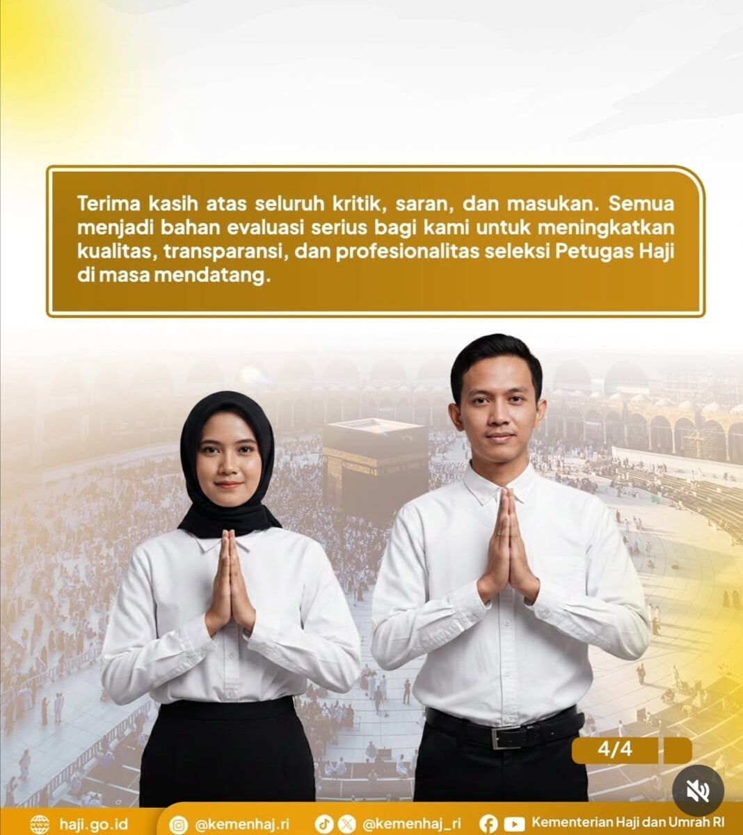 Seluruh kritik, saran, dan masukan dari masyarakat, lanjut kementerian, menjadi bahan evaluasi serius guna meningkatkan kualitas, transparansi, dan profesionalitas seleksi Petugas Haji di masa mendatang.