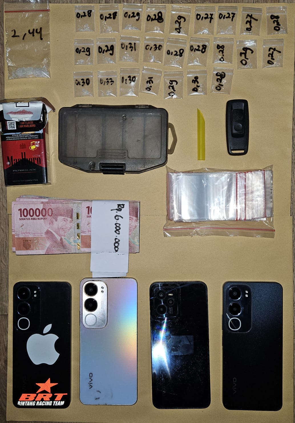 Kedua pria tersebut kemudian diamankan dan diketahui berinisial F.A. dan A.S. Saat dilakukan penggeledahan, polisi menemukan satu paket sabu seberat 2,44 gram bruto yang disimpan di dalam kotak rokok.