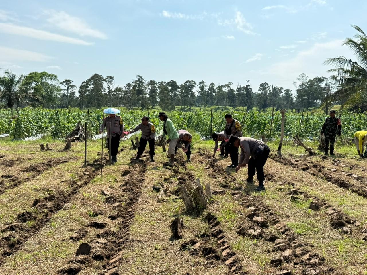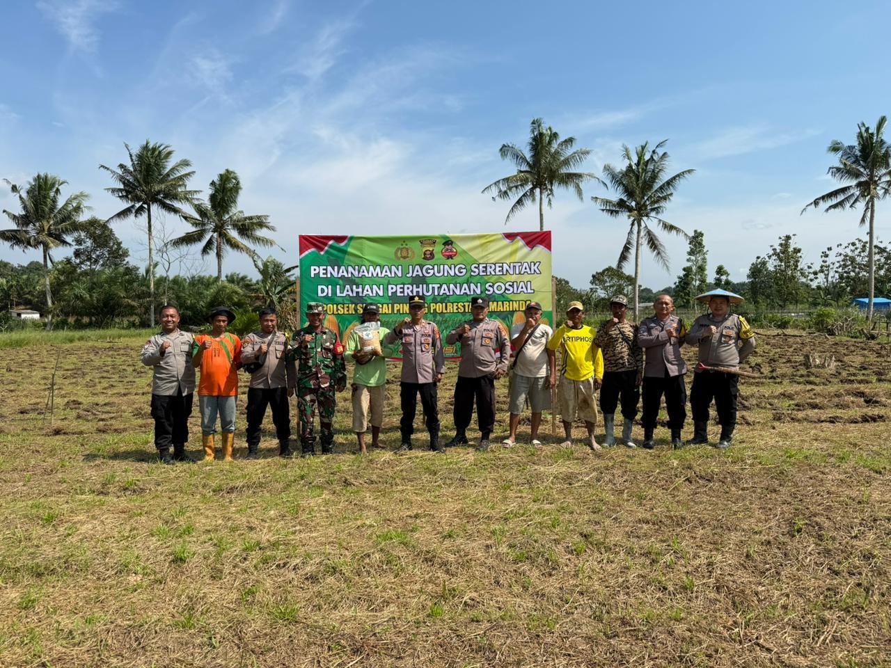 Kegiatan dimulai pukul 09.00 WITA, dipimpin langsung Wakapolsek Sungai Pinang AKP Subagyo bersama Bhabinkamtibmas Sungai Siring Aipda Harys Yus, didukung 8 personel kepolisian. Mereka turun langsung ke lahan seluas 1 hektare milik Bapak La Kanda, yang menjadi mitra dalam kegiatan ini.